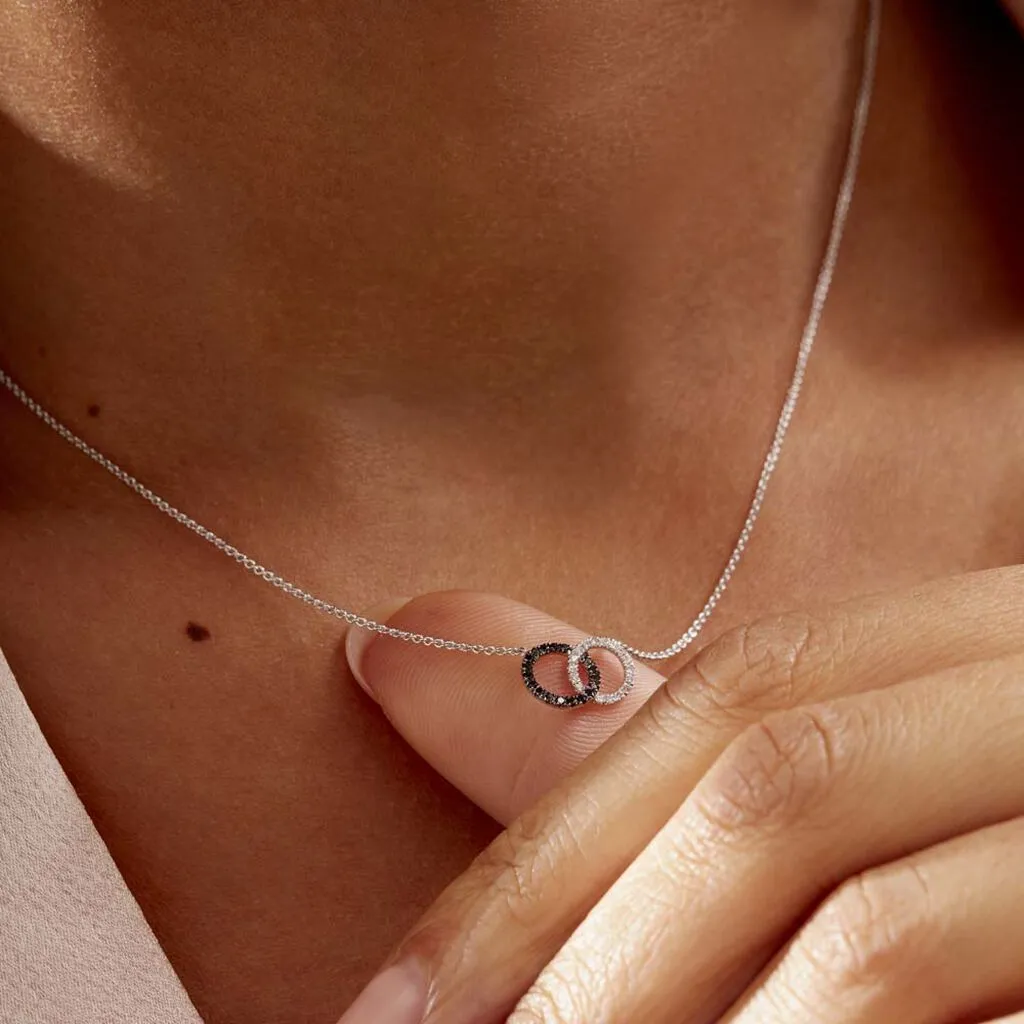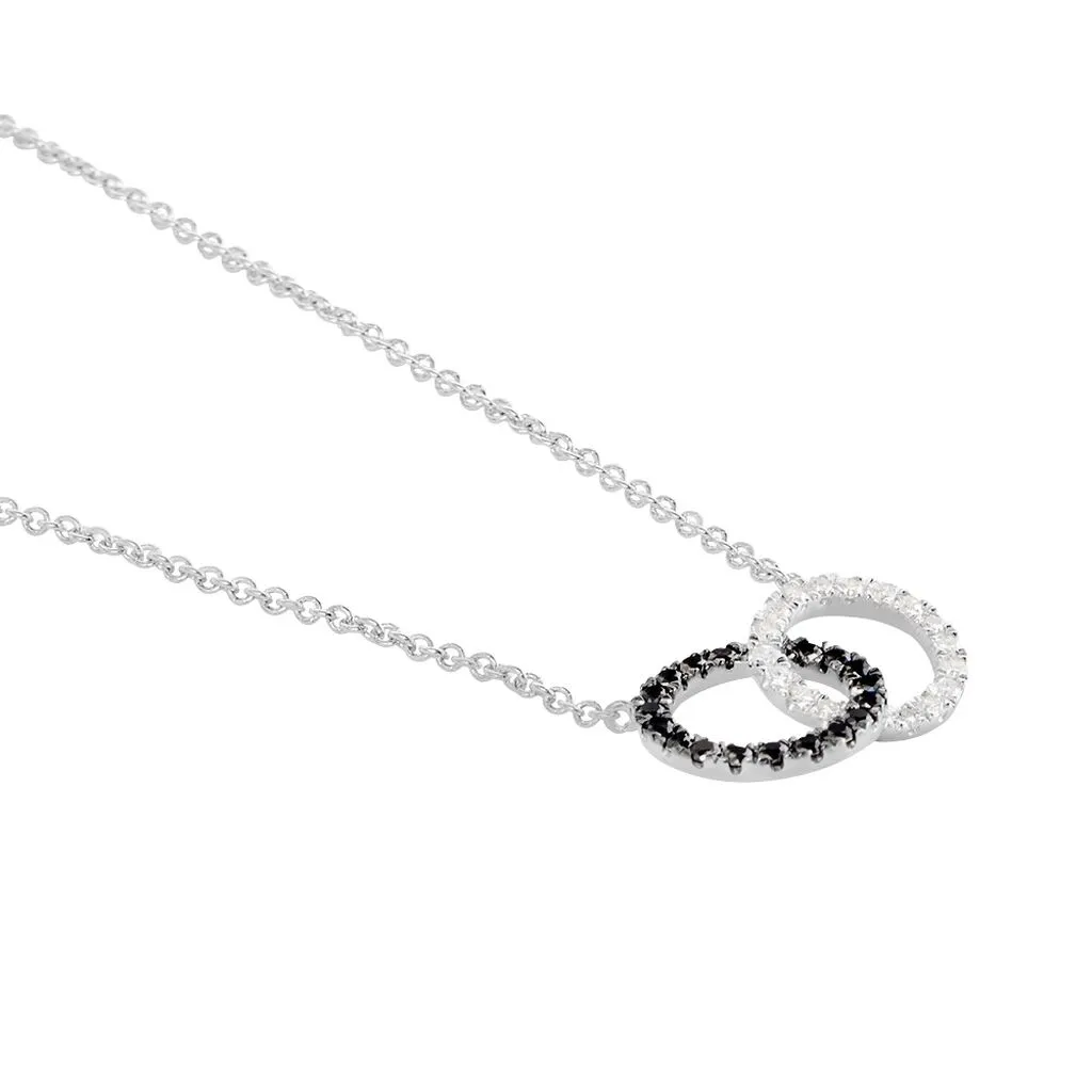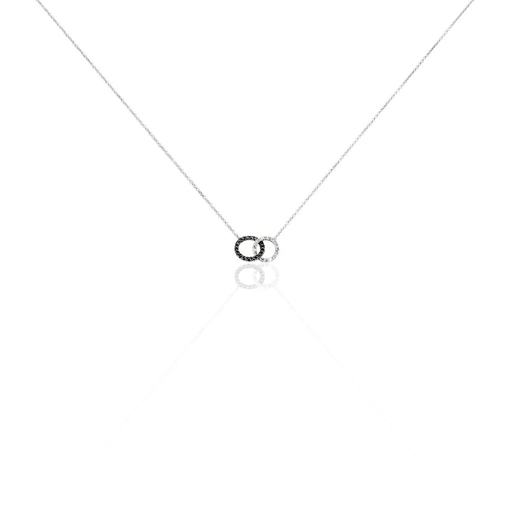 Collier Or Blanc 375/1000 Toi&moi Cercles Entrelaces Diamants Blancs Et Diamants Noirs
