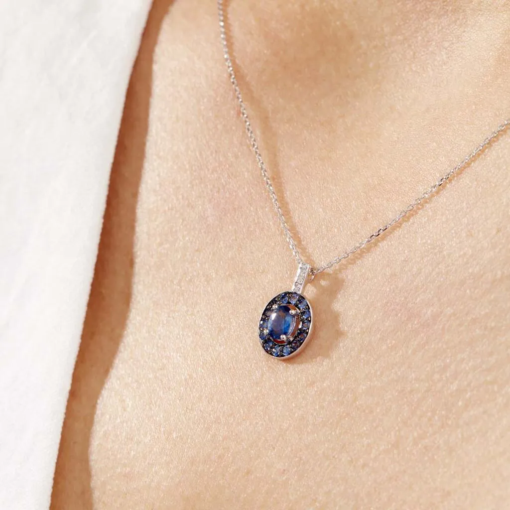 Collier Or Blanc 375/1000 Saphir Central Entourage Saphirs Bélière Pavage Diamants 42cm