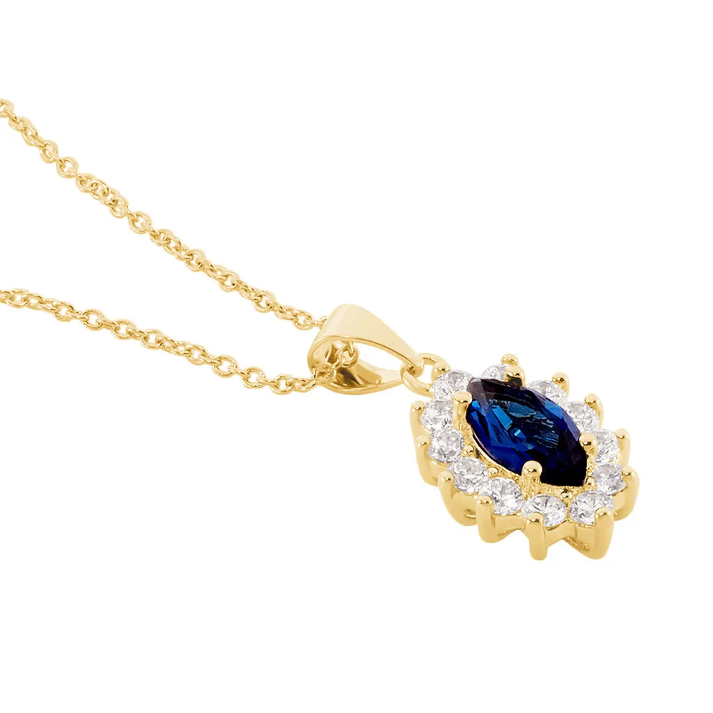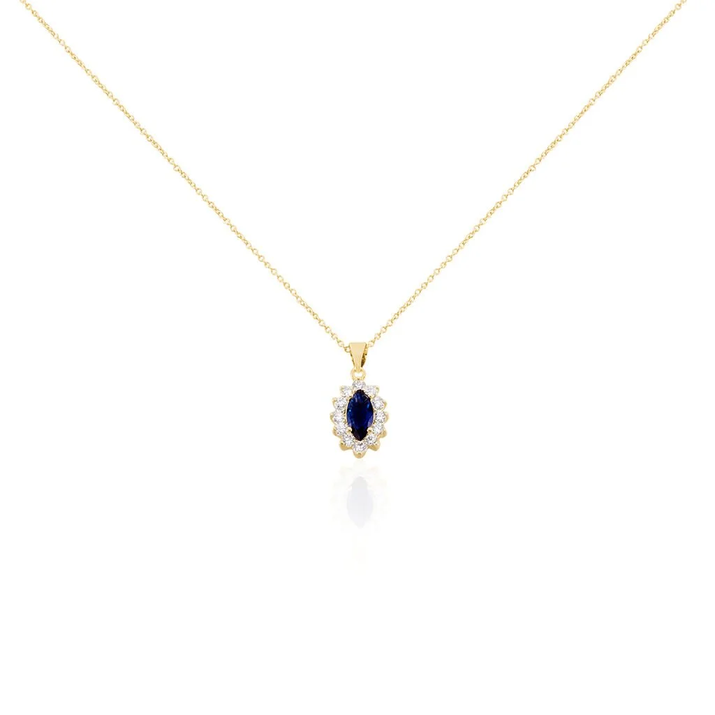 Collier Plaqué Or Jaune Entourage Marguerite Oxydes De Zirconium Pierre Bleue Centrale Forme Navette 44cm