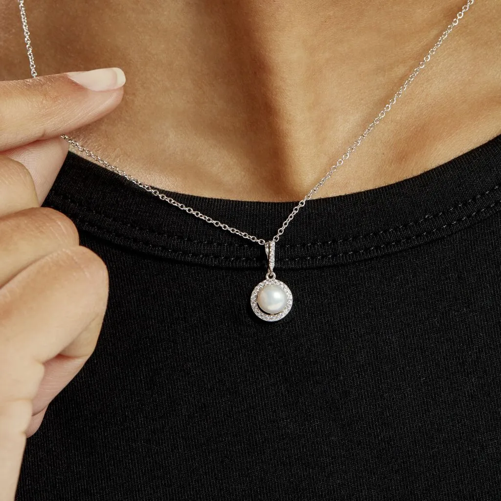 Collier Argent Blanc 925/1000 Perle De Culture 6mm Entourage Oxydes De Zirconium 45cm
