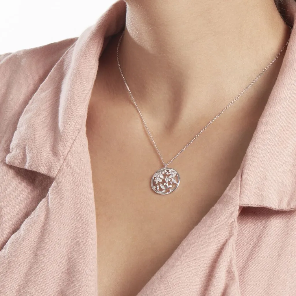 Collier Argent Blanc 925/1000 Feuillage Rond Sertis Griffes Oxydes De Zirconium Maille Forçat 45cm