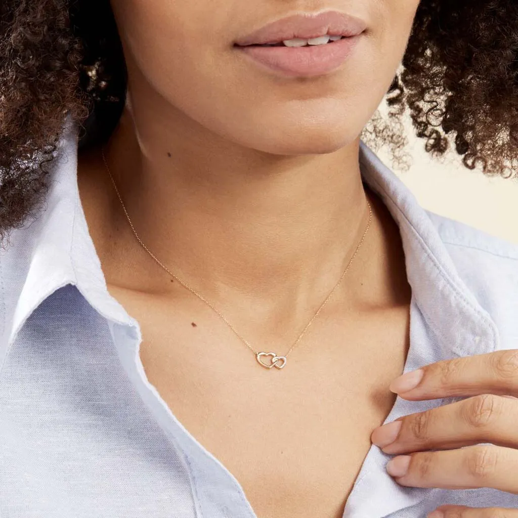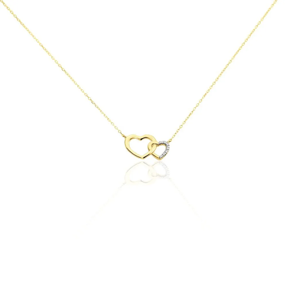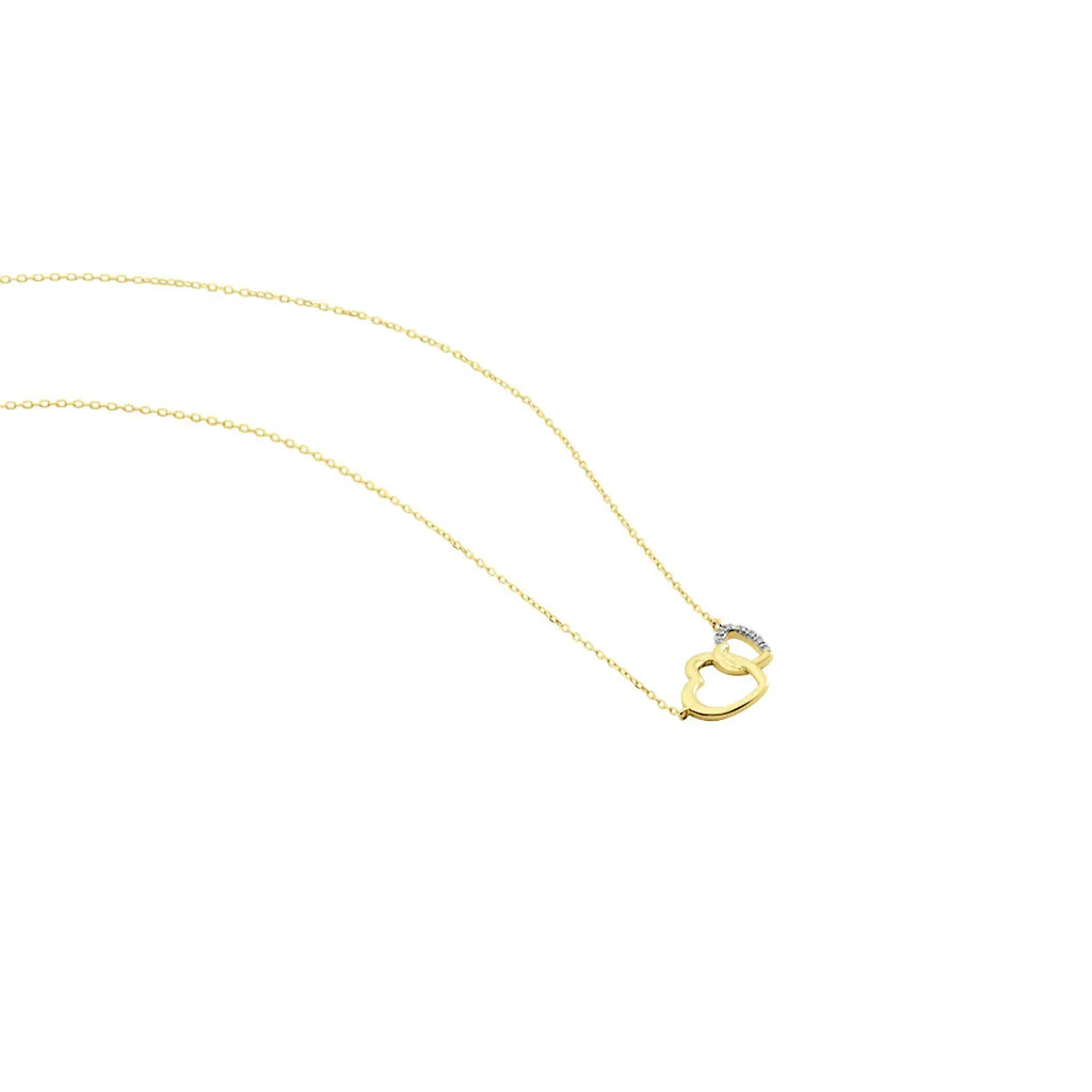 Collier Or Jaune 375/1000 Forme Double Cœur Pavage Diamants Blancs Maille Forçat 40+2cm