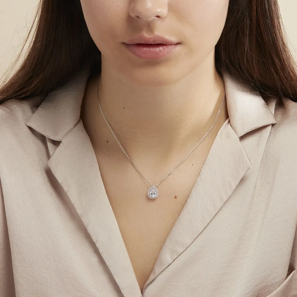 Collier Argent Blanc 925/1000 Solitaire Oxyde De Zirconium Central Forme Poire Entourage Oxydes De Zirconium 45cm
