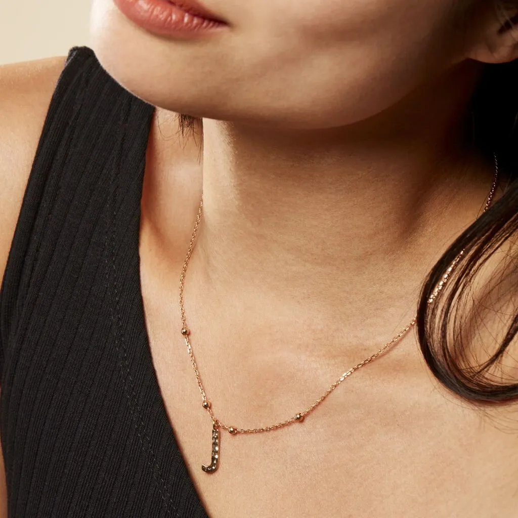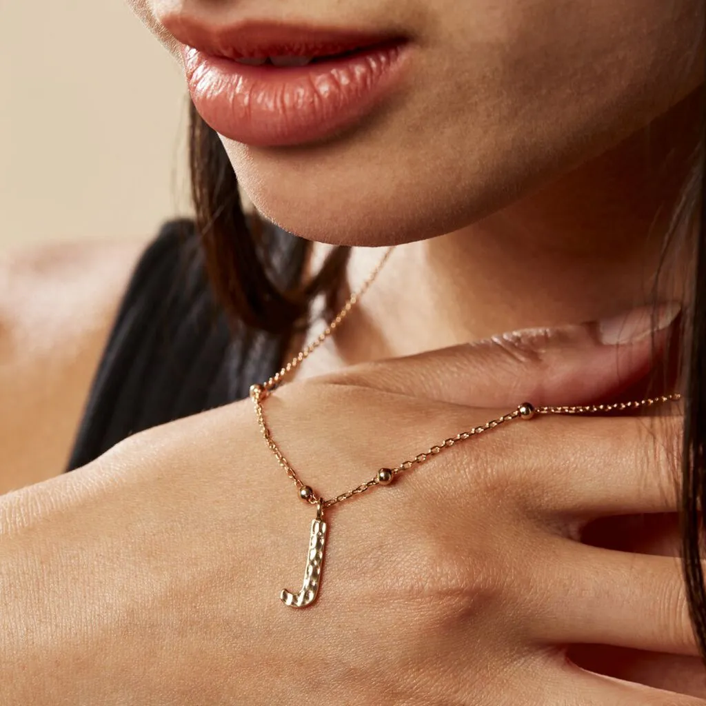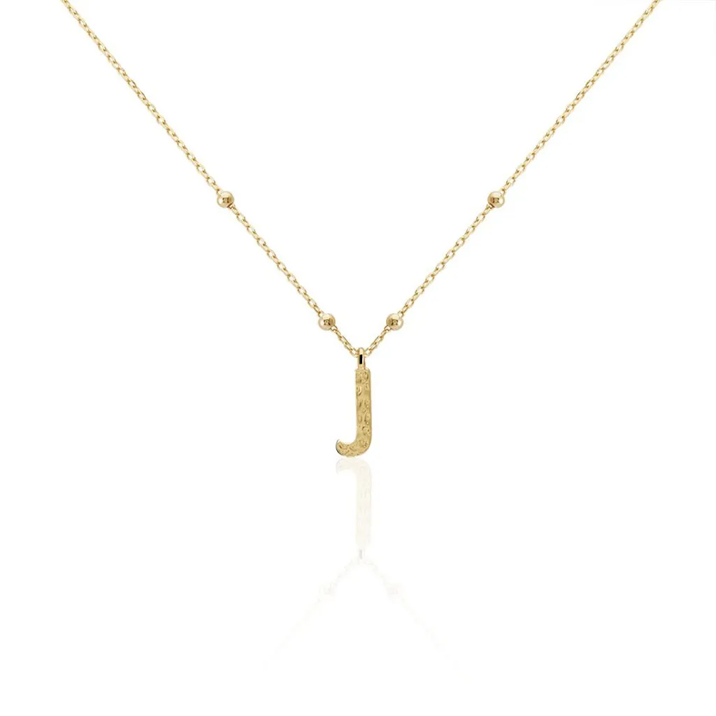 Collier Plaque Or Jaune Lettre J Martelee Et Petites Boules Chaine Maille Forcat Longueur 45cm