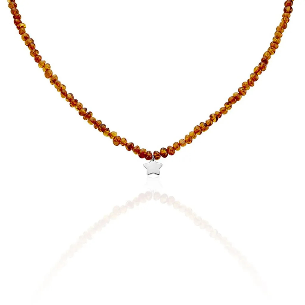 Collier Ras De Cou Argent 925/1000 Ambre Coloris Cognac Pendentif Etoile 36cm