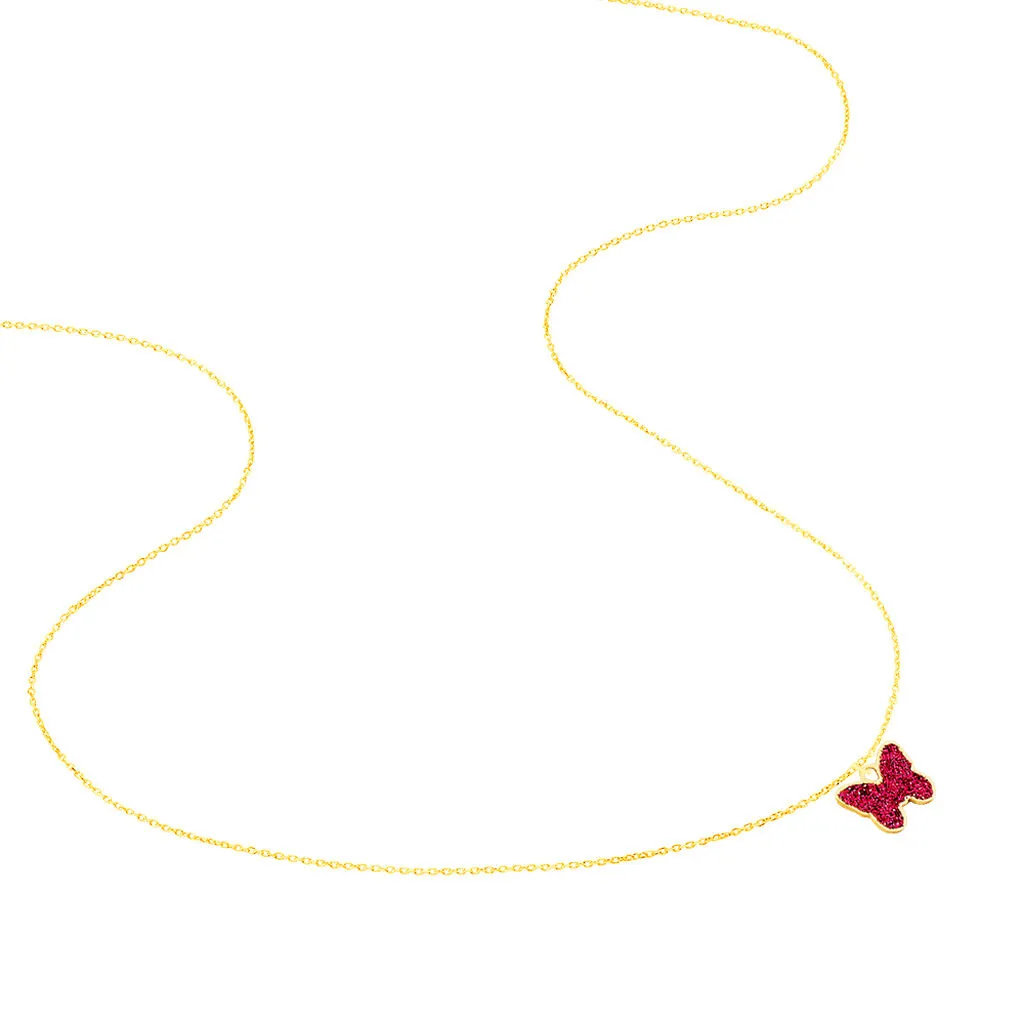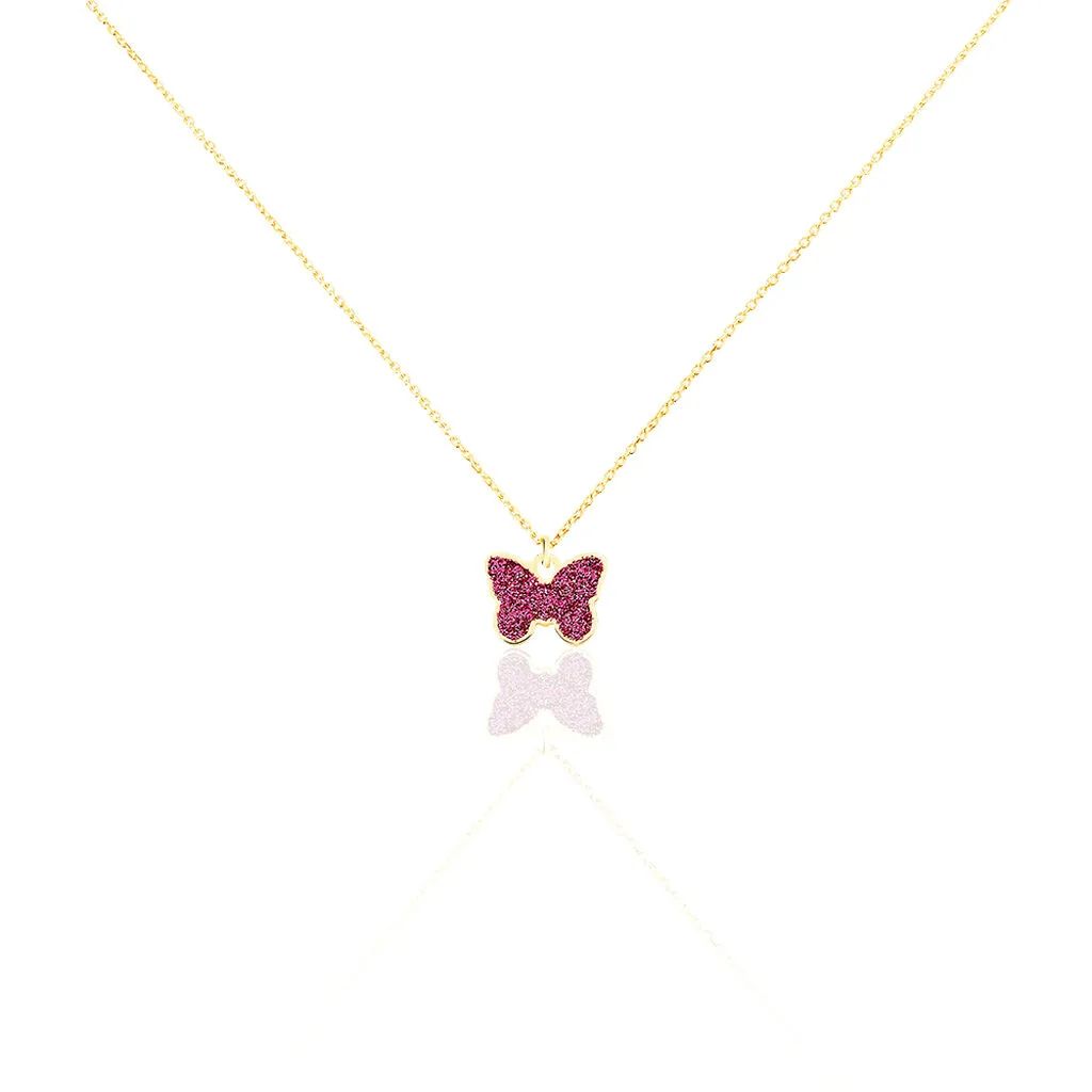 Collier Or Jaune 375/1000 Papillon Glitter Fushia Maille Jaseron 38cm