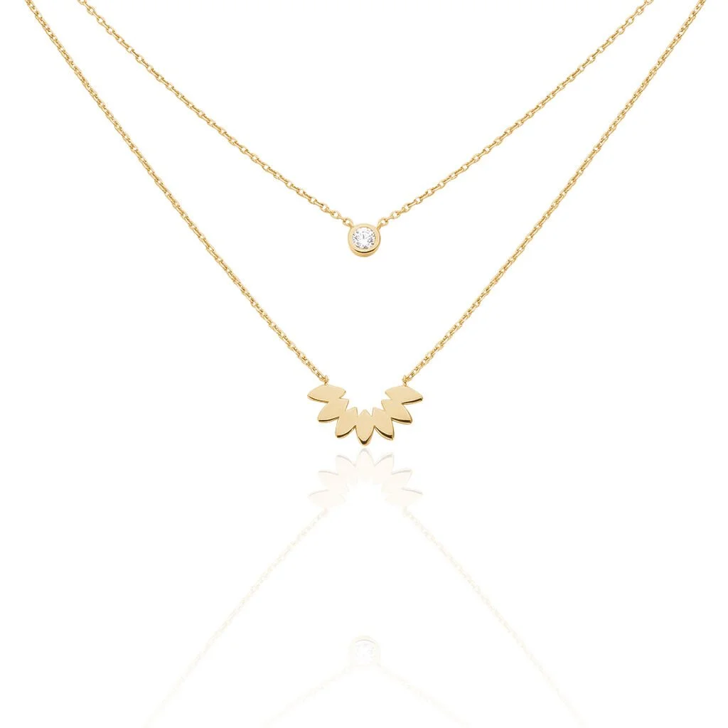 Collier Plaqué Or Jaune Double Chaines Motif Demi Fleur Et Oxyde De Zirconium 45cm